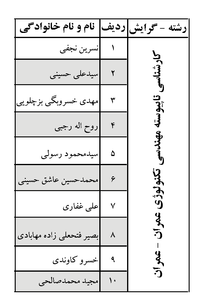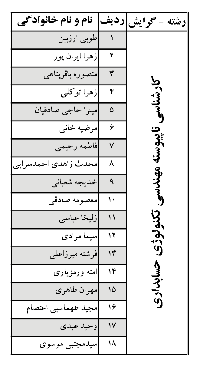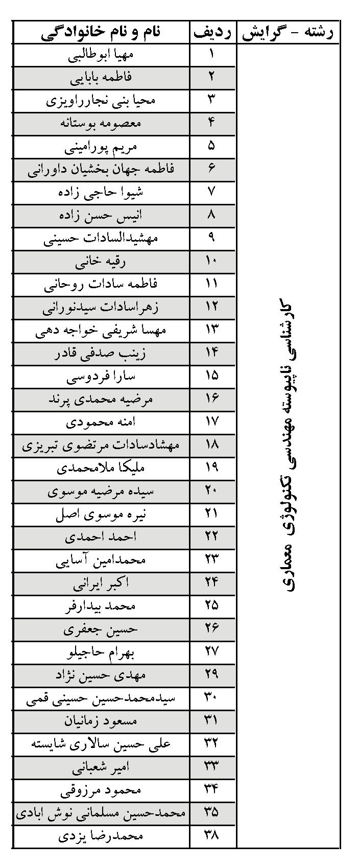 دانشجويانی که اسامی آنها در لینک رشته های زیر آمده است، مي بايست هرچه سريعتر جهت تکميل مدارک خود به اداره کل آموزش مراجعه کنند. درصورت عدم مراجعه، از حضور آنان در امتحانات پايان ترم نيمسال اول سال تحصیلی 93-92 و ثبت نام و انتخاب واحد آنان در نیمسال دوم سال تحصیلی 93-92 ممانعت به عمل خواهد آمد.