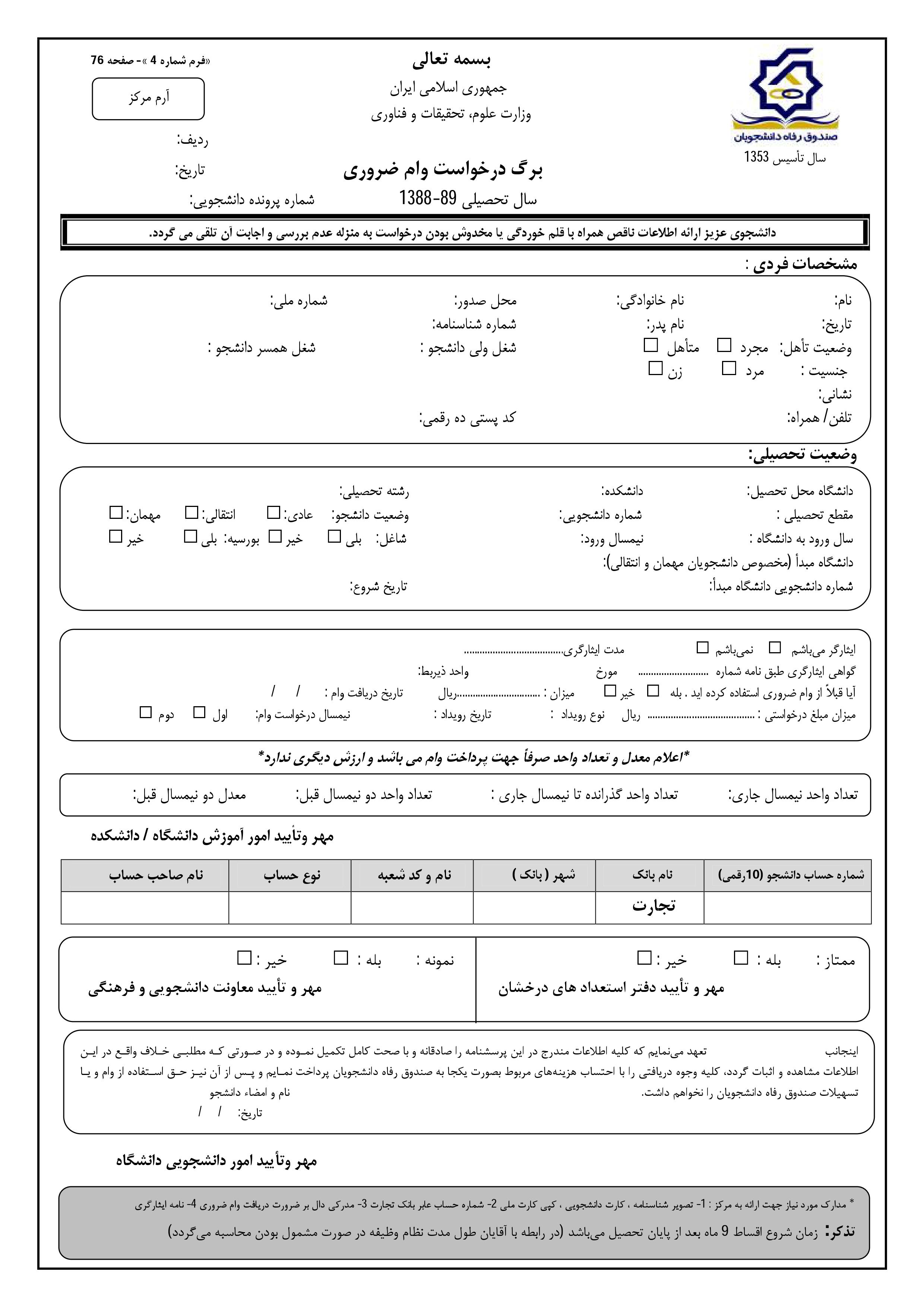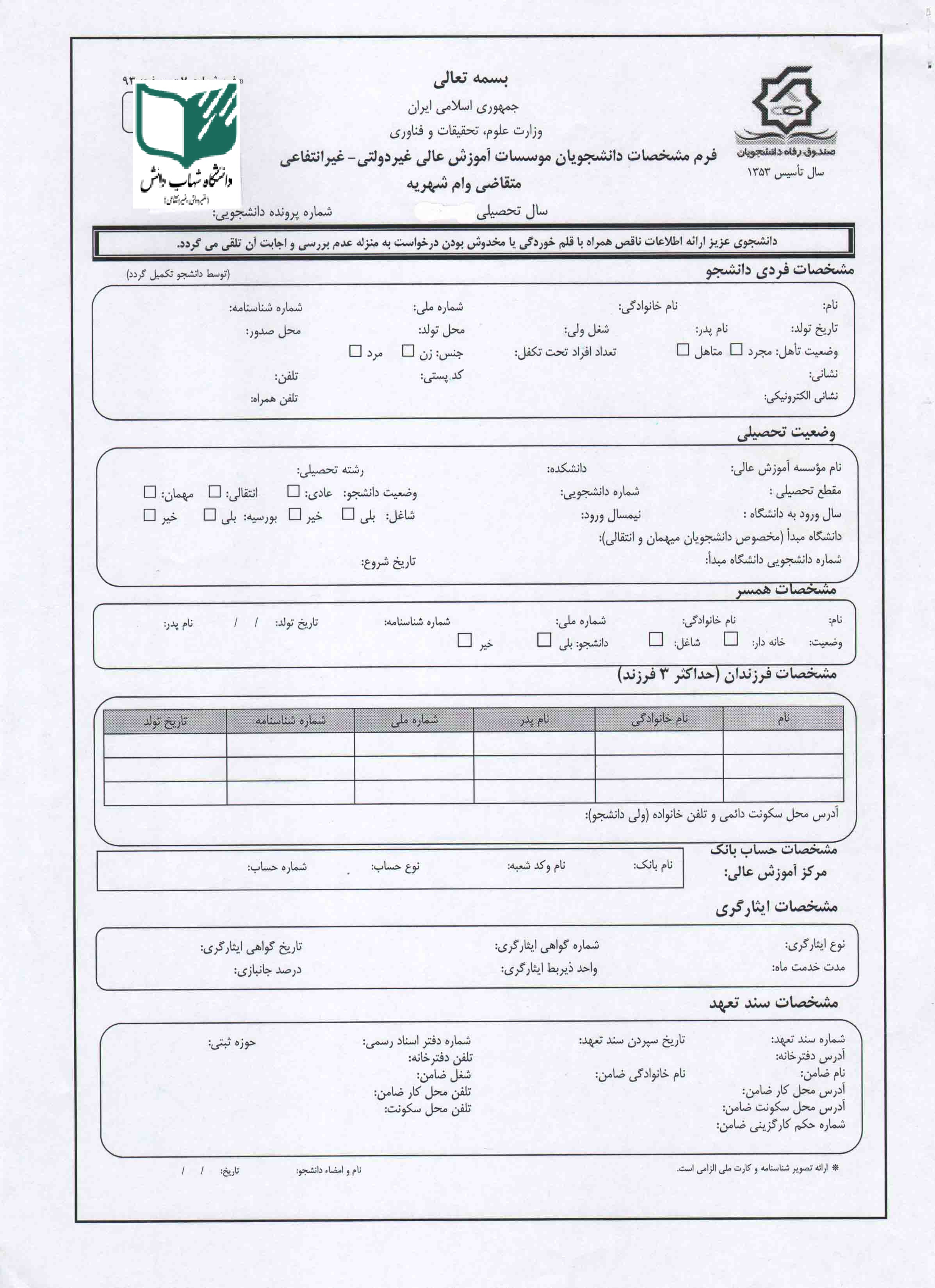 فرم مشخصات دانشجویان متقاضی وام شهریه