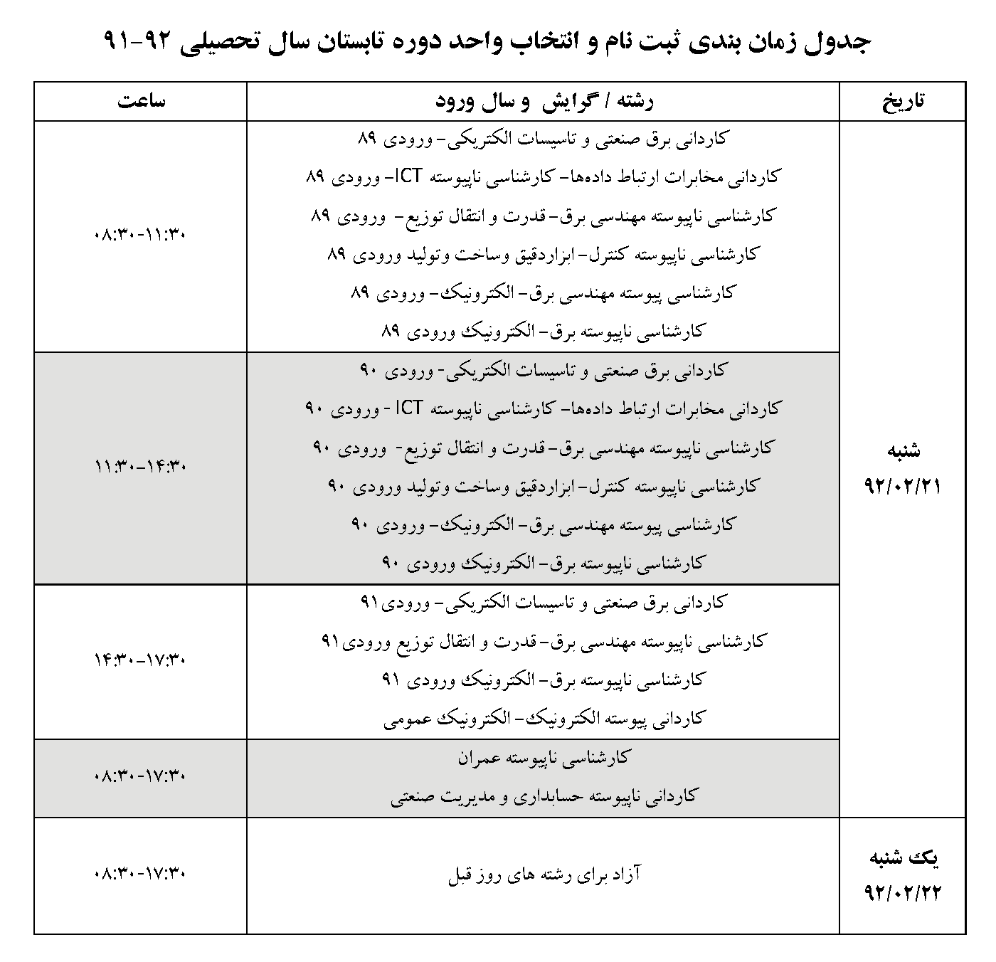 جدول زمان بندی ثبت نام و انتخاب واحد دوره تابستان سال تحصیلی 92-91