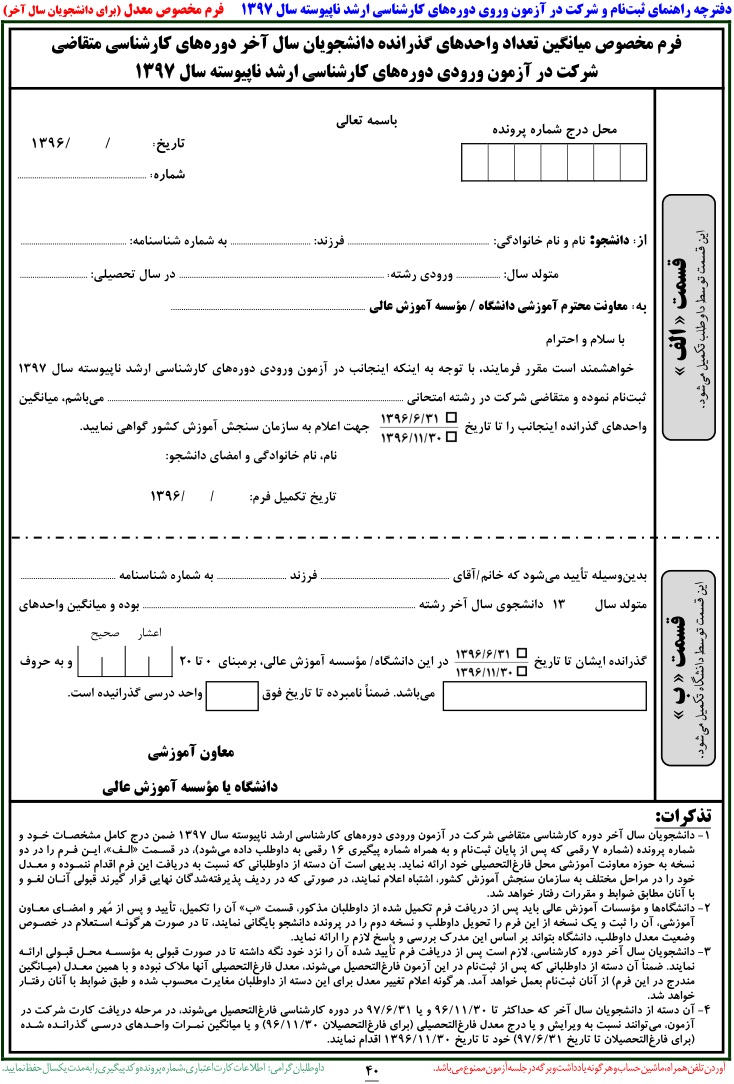 تبصره 2- آن دسته از پذيرفتهشدگاني كه در زمان اعلام نتايج اوليه و تكميل فرم انتخاب رشته (مورخ 97/03/12 لغايت 97/03/24) دانشجوي سال آخر بودهاند و حداكثر تا تاريخ 97/06/31 فارغالتحصيل ميشوند، دانشجوي سال آخر شناخته شده و لازم است فرم معدل دانشجويان سال آخر مندرج در صفحه 40 دفترچه راهنماي (شماره 1) يا صفحه 268 دفترچه راهنماي انتخاب رشتههاي تحصيلي (شماره 2) را از موسسه آموزش عالي محل فارغالتحصيلي دوره كارشناسي دريافت و آن را در زمان ثبتنام به دانشگاه محل قبولي ارائه نمايند.