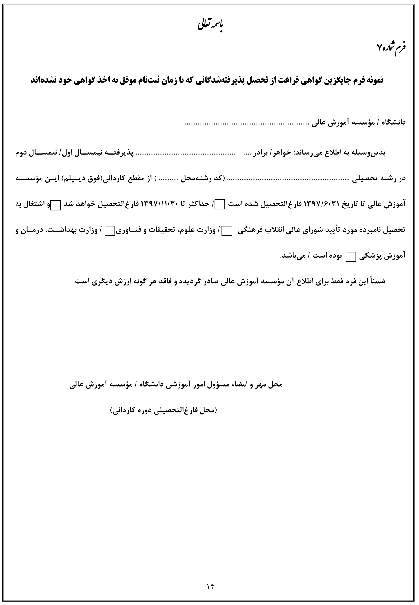 آن دسته از پذیرفته شدگانی که امکان ارائه اصل یا گواهی مدرک کاردانی را ندارند، می بایست فرم شماره 7 تایید شده توسط دانشگاه یا موسسه محل اخذ مدرک کاردانی را هنگام ثبت نام ارائه نمایند.